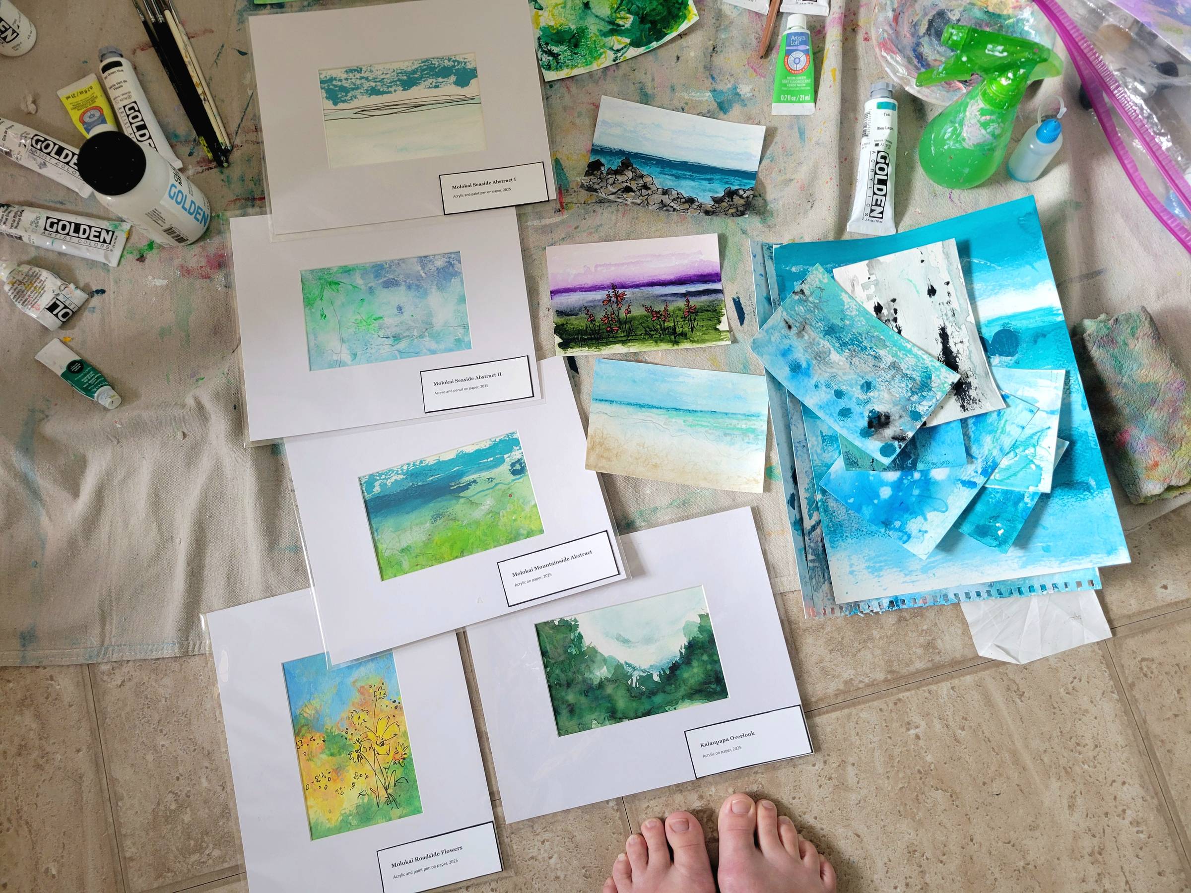 I am happy to report that there isn't much to report this week. And after all the excitement of last week, that's quite a relief! Dipper is still herding her four little fluffbutts around and there's only been a singular mongoose sighting in the past week. Which was OUTside the house, thank goodness! I've been working on the shawl pattern a bit, but I still haven't gotten it off the blocking boards for photos yet. Three weeks ago I strained something in my lower back and I've been struggling with trying to rest and recover from that. I keep messing it up again, accidentally. It's quite frustrating! I started doing some light yoga again and I honestly can't tell if it's helping or hurting, but I don't want to lose too much progress, either. So there's been lot of stretching and a lot of wandering around kind of aimlessly because I can't sit still for too long or it starts to bother me more. Which isn't doing a whole lot of good for my productivity! But I'm slowly chipping away at the to do list. How is yours looking so far this fall? Do you have a lot of gift making planned?? I'm planning on participating in the Fasten Off Yarn-a-Long as well as the Indie Gift-A-Long on Ravelry again this year, so if you're a mad holiday knitter or crocheter, be sure you stay tuned for more on those two upcoming events! Finalizing my 2026 calendar is also on the list and it's creeping up pretty close to the top. It looks like I'll actually be doing two calendars this year, though, so that's kind of fun! I'm trying to finish up the last couple paintings to round out the collections for each one. The Island Abstracts theme seemed like it would be a no brainer, but apparently I did all my best seascape painting on Molokai! 😆 Here's a peek behind the scenes of my hot mess of a studio floor as I try to sort through what I have, what I like, what is meh, or what. I'm almost there, though. My stack of no good paintings is definitely going to be bigger than the keepers this time. But hopefully they can all be painted over or repurposed. Painting is definitely easier (and quicker) to do that with than crocheting, at least! Speaking of crocheting, I don't think I've crocheted not one single stitch this past week! Huh. I just now realized that. Sometimes it's hard to balance the creative work with the computer work. Although I guess I've been making more time for painting recently, thanks to the Bloomtober challenge, so that's just a different sort of creative time! And it does often fuel the crochet time.