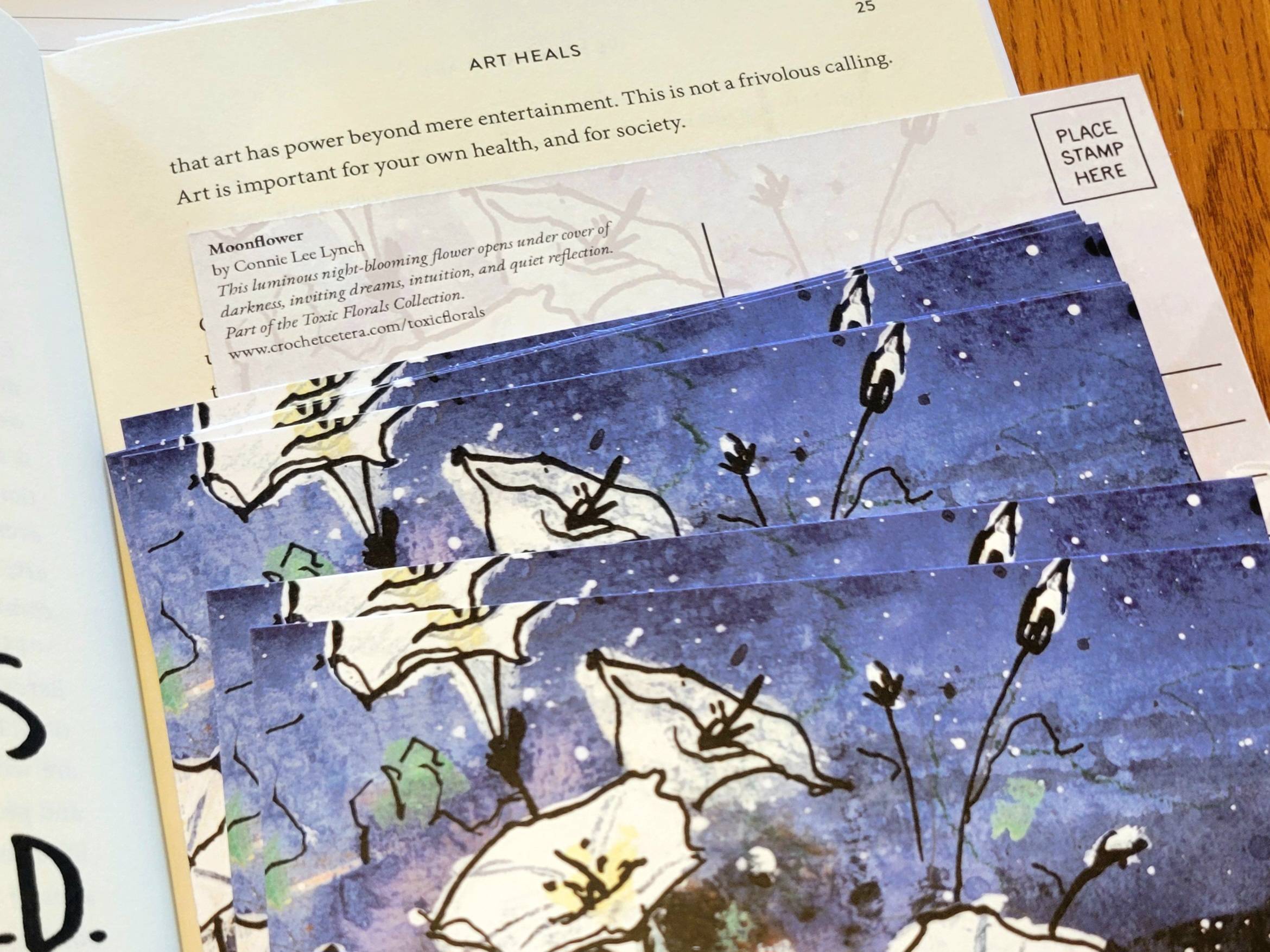 I'm sitting at my kitchen table this morning, coffee growing cold in my blue Molokai mug sitting beside me. The rose-ringed parakeets are squabbling and squawking at the bird feeder on our back porch while a handful of feral chickens meander hopefully underneath it, anxiously waiting for some choice morsel to get tossed out for them to gobble up. I'm sitting here letting my coffee get cold because, like many of you, I'm sure, my heart is so very heavy right now, and I just can't seem find the right words. Except for these: Now is the MOST important time for you to keep creating. In whatever way it is that you create. Keep seeking out joy and beauty in this world, wherever you can find it. Be kind and compassionate to yourself and others. Support your local businesses and community when you're able. Give to causes that matter to you, if you can. And remember that it's okay if some days the only thing you accomplish is getting through it. Keep chasing joy and gratitude. Keep creating. Because, as Amie McNee tells us, we may think that art "merely decorates the world. But it changes it." Actually, if you haven't seen her TEDx talk, here's the link. She's going to tell you that you should make art especially when the world is on fire. So whether it's crocheting or putzing in your garden or making snow angels or baking your famous apple pie for a neighbor or maybe just having a mad scribble with a pen, I hope you'll go do something creative today. As for me, now that it's after noon, I'm going to go reheat my cold coffee before it gets so late that I have to pour it out (no caffeine after 3pm), and then I think I'll crochet a little more on this new design I'm working on. (Inspired by wild passionflower blooms.) Take care. -Connie P.S. Don't forget to look for small delights, even if it's unexpected guests with fluffy yellow butts who run away as soon as you open the door to say hello. P.P.S. I just went and counted and I have ten moonflower postcards left. If you'd like a little pop of color in your mailbox, join me on Patreon by January 31st, and I'll send one your way. I know it's a small thing, but it's my favorite way to put a little extra joy out in into the world right now. |