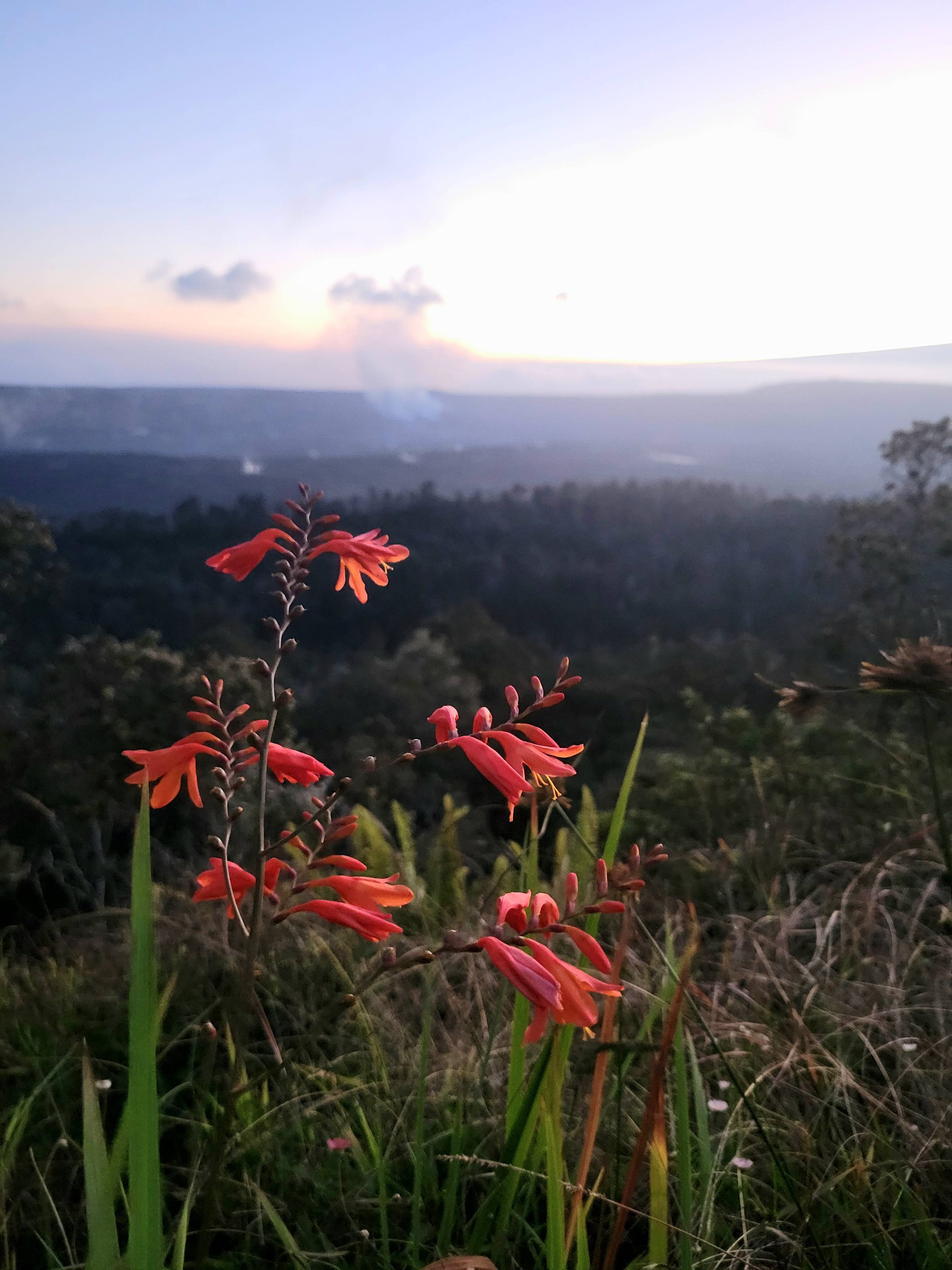 All right. I'm gonna go do some spinning now. By this time next week, I hope to be well into the crocheting or maybe even finished with it! Wish me luck. The Hawaiʻi Craftsmen Annual Statewide Exhibition submission deadline looms soon ahead... Lots to do! -Connie P.S. This was my favorite picture from our trip; there's just something magical about this moment captured at dusk, beautiful bright red montbretia blooming with Kīlauea quietly smoking in the background... |