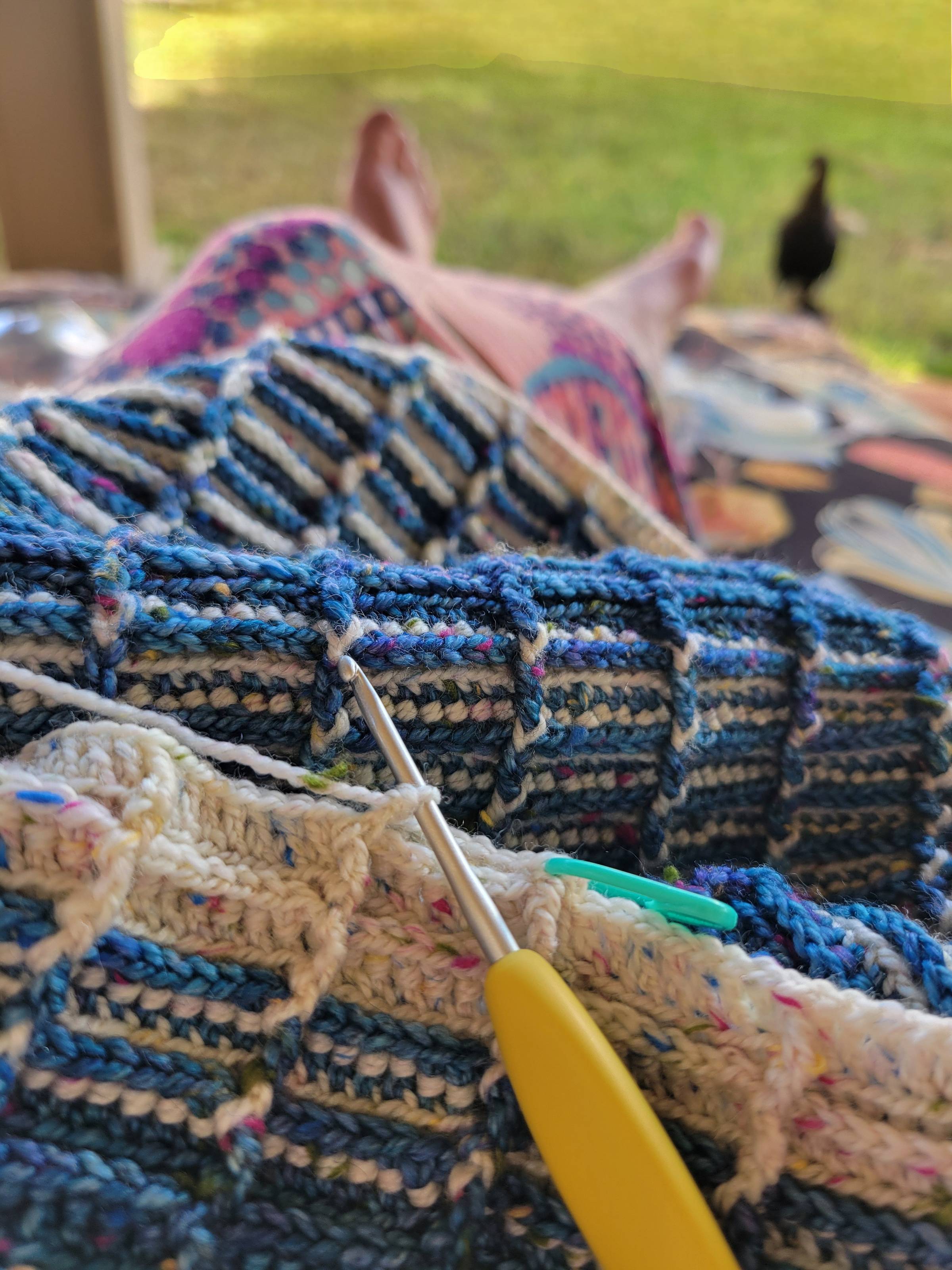 I am happy to report that there isn't much to report this week. And after all the excitement of last week, that's quite a relief! Dipper is still herding her four little fluffbutts around and there's only been a singular mongoose sighting in the past week. Which was OUTside the house, thank goodness! I've been working on the shawl pattern a bit, but I still haven't gotten it off the blocking boards for photos yet. Three weeks ago I strained something in my lower back and I've been struggling...