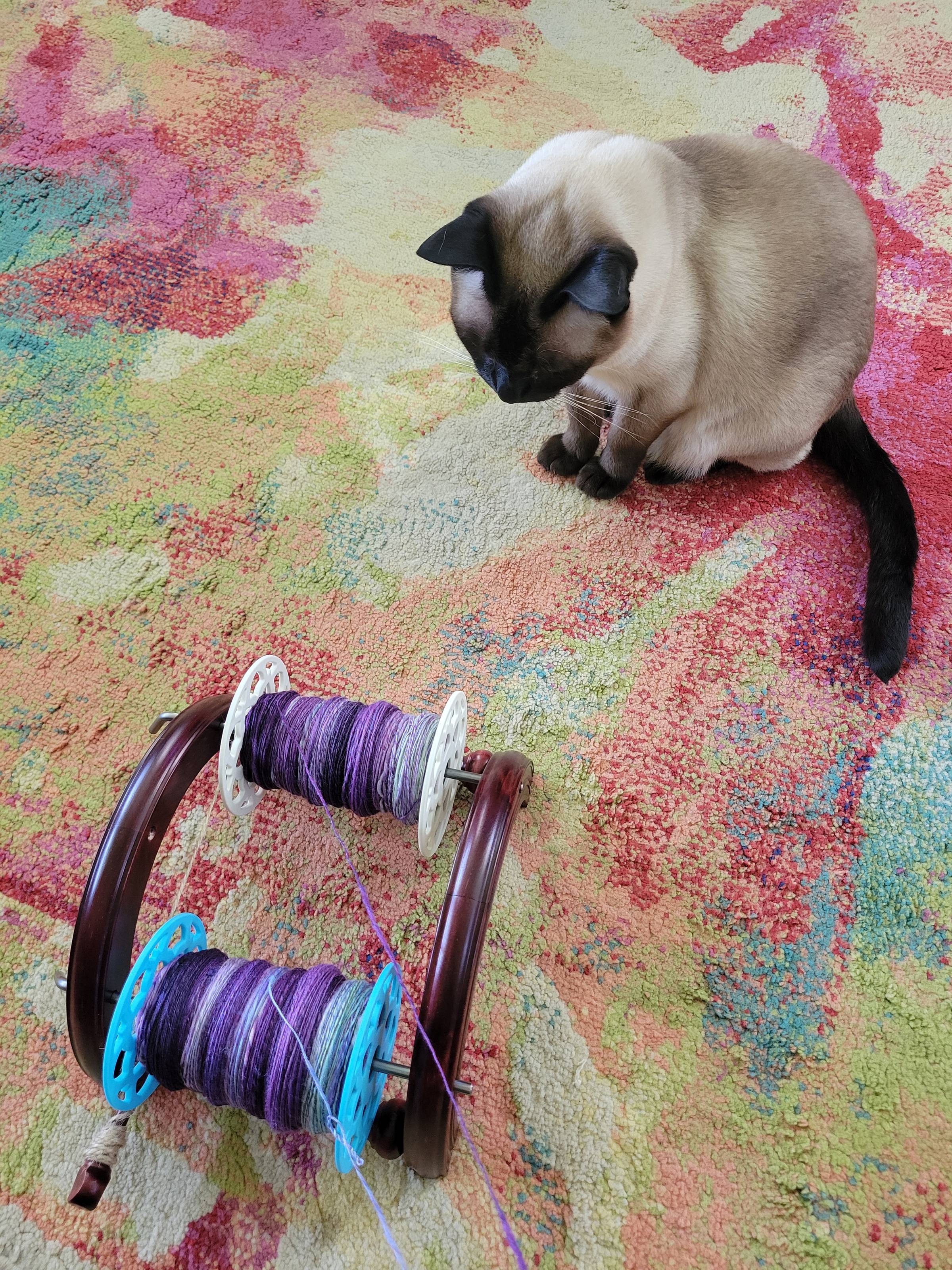 Also, and I had NO idea she was even doing this, Kate Larson made a knit version of the pillow cover, inspired by my note about doing so in the modifications ideas section of the pattern, and it turned out so stinkin' cute!! You can check THAT out here. Also, for even more color inspiration, because we all know you can never get enough of that, here's a look at the test version I made while I was waiting for and spinning the fiber for the magazine version: I used some DK weight yarn from my stash, so my stitch count was different to get a similar size, but this pattern is super easy to adapt because you don't need any specific stitch count. If you'd like to, you can check out my project page on Ravlery for more details. And, clearly, it makes a great stashbuster project!! Since, I know, most of you probably are not spinners. What I especially love about spinning, though, as a crocheter, is that I can create Z-twist yarn for my projects, which works WITH the (right-handed) crocheter as you work, NOT untwisting the yarn. Most commercial yarns are S-twist, which is ideal for knitters, but that's actually a whole 'nother rant that I won't get into right now. 👀 Instead, just look at this scrumptious yarn I was able to make for this project!! 😍 Not to put down the natural fibers, but Kim is hands down one of my favorite indie dyers for fiber. And yarn, too! But I always love spinning with Kim's fibers. The colors are just so good. If you've never tried her yarn, you can visit her website here. Tell her I sent you! All right, enough gushing. Go check out the magazine! It will probably be my only magazine publication this year because I don't have anything else currently in the works. For magazines, at least. ;) Do you think you'll be making one of these?? I don't do home decor items very often, but I love the idea of being able to swap out decorative pillow covers seasonally, so I may do some more! Since I now have two of them, already. What colors would YOU choose if you were to make one for your home or craft space?? Hit reply and let me know! Chat again soon. -Connie P.S. I forgot to download my photos off the big camera that I took of Mabel and her chicks over the past week (we're out of town for a few days) so here are a couple pictures of my supervisor, Truman, inspecting my work for the magazine instead: |
